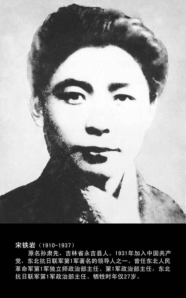 宋铁岩(1910-1937)原名孙肃先,字晓天,曾用名宋占祥、铁坚、铁英、孙铿、孙克敏等,吉林省永吉县人。1931年春考入北平中国大学,不久加入中国共产党。历任南满游击队政委、曾任东北人民革命军第1军独立师政治部主任、第1军政治部主任、东北抗日联军第一军政治部主任等职务,是中共南满特委、南满省委委员。